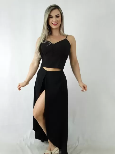 Conjunto em Crepe Short Saia e Blusa Cropped com Botões.