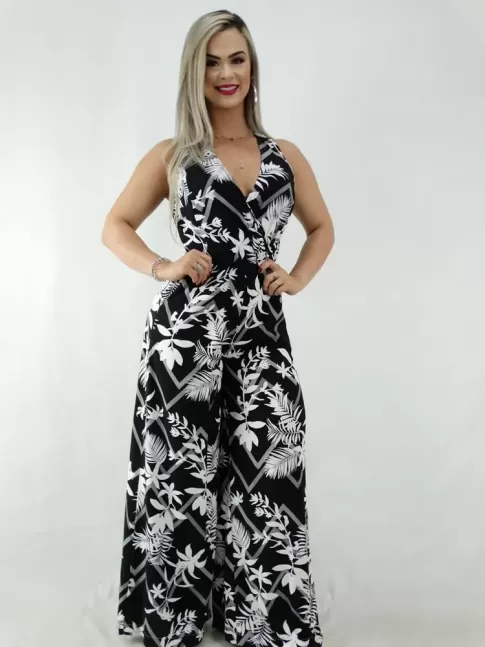 Macacão Pantalona em Viscose Alça Larga Decote Transpassado.